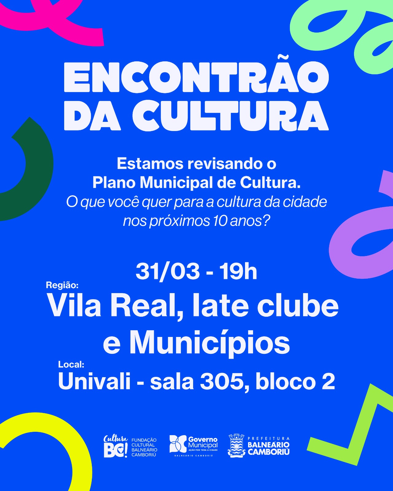 Na noite desta terça-feira (31), moradores dos bairros Vila Real, Iate Clube e Municípios terão a oportunidade de participar das discussões do novo Plano Municipal de Cultura (PMC) de Balneário Camboriú, que está em fase de elaboração. Denominada de "Encontrão da Cultura - Regional", a reunião com a comunidade ocorrerá no Campus da Univali de Balneário Camboriú (5ª Avenida, 1100, Sala 305, Bloco 2), às 19h, com entrada gratuita.