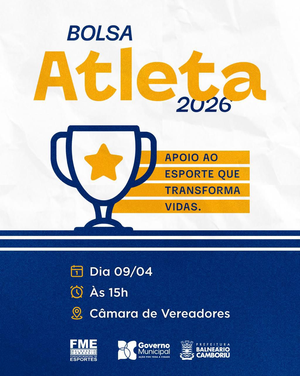 A Prefeitura de Balneário Camboriú, por meio da Fundação Municipal de Esportes (FME), realizará uma entrega simbólica de certificados para os contemplados no Programa Bolsa Atleta de 2026. O evento será promovido às 15h desta quinta-feira (9), na Câmara de Vereadores da cidade.